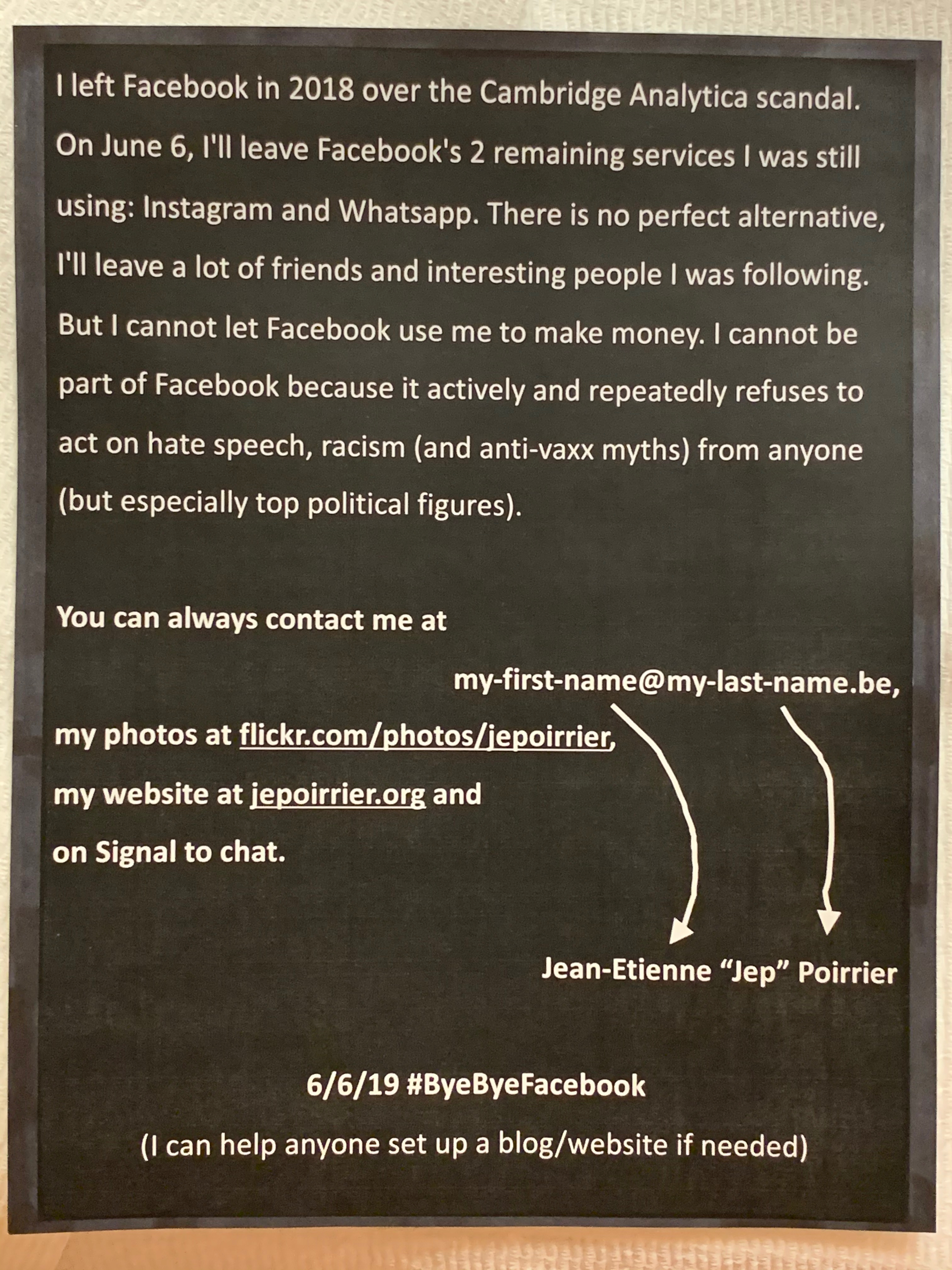 Note that, on June 6, 2020, I left WhatsApp and Instagram, the 2 last services from Facebook I was using (after leaving Facebook in 2018). WhatsApp unfortunately doesn’t warn people that their counterpart left (that’s dumb) so here it is: you won’t find me on WhatsApp and I can’t reply to your messages there (I don’t know you sent me anything). You can join me on Signal to chat.