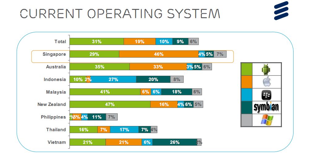 Tonight I was wondering what was Android market share in Asia. It is 31% according to a recent study from Ericsson’s ConsumerLab group (reported by TechRepublic). Although dominant through most studied countries, Android is not dominant in Singapore (iOS has 46%), in Indonesia (RIM has 29%) nor in Vietnam (Symbian has 26%).