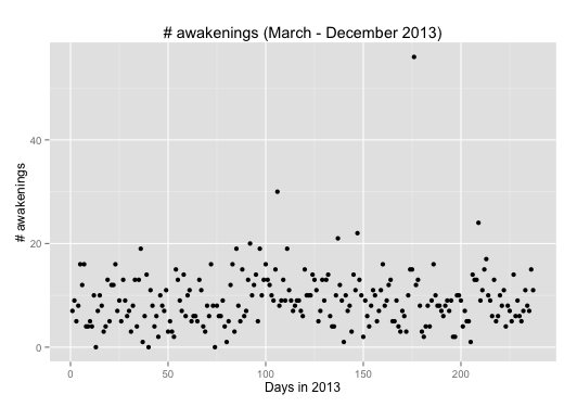The simple plot of the number of awakenings over time shows the same non-significant trend as the sleep duration (above). The histogram of these awakenings shows a more skewed distribution to the left (to a low number of awakenings) (than the sleep duration). This however shows there is a relation between the two variables: the more I sleep the more the Flex detects awakenings (see second graph below).