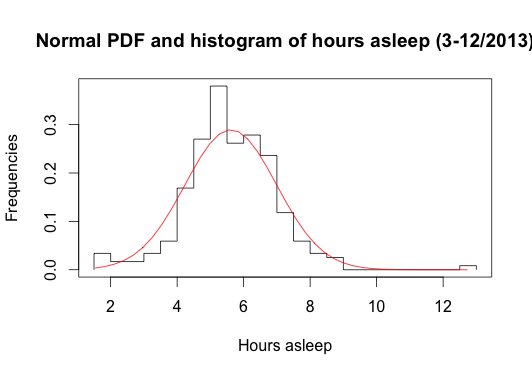 R allows to study the data in many different ways (of course!). When plotting the distribution of durations asleep it seems this may be distributed like a normal (Gaussian) distribution (see the graph below). But the Shapiro-wilk normality test shows that the data doesn’t belong to a normal distribution.