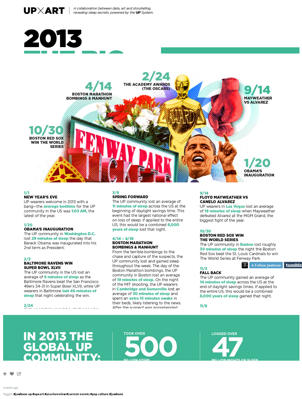 So I slept 5 hours and 37 minutes on average in 2013 with one very short night of 92 minutes and one very nice night of 12 hours and 44 minutes. Fitbits devices do not detect when you go to sleep and when you wake up: you have to tell tem (for instance by tapping 5 times on the Flex) that you go to sleep or you wake up (by the way this is a very clever way to use the Flex that has no button). Once told you are in bed the Flex manages to determine the number of minutes to fall asleep, after wakeup, asleep, awake, … The duration mentioned here is the real duration the Fitbit device considers I sleep (variable minutesAsleep).