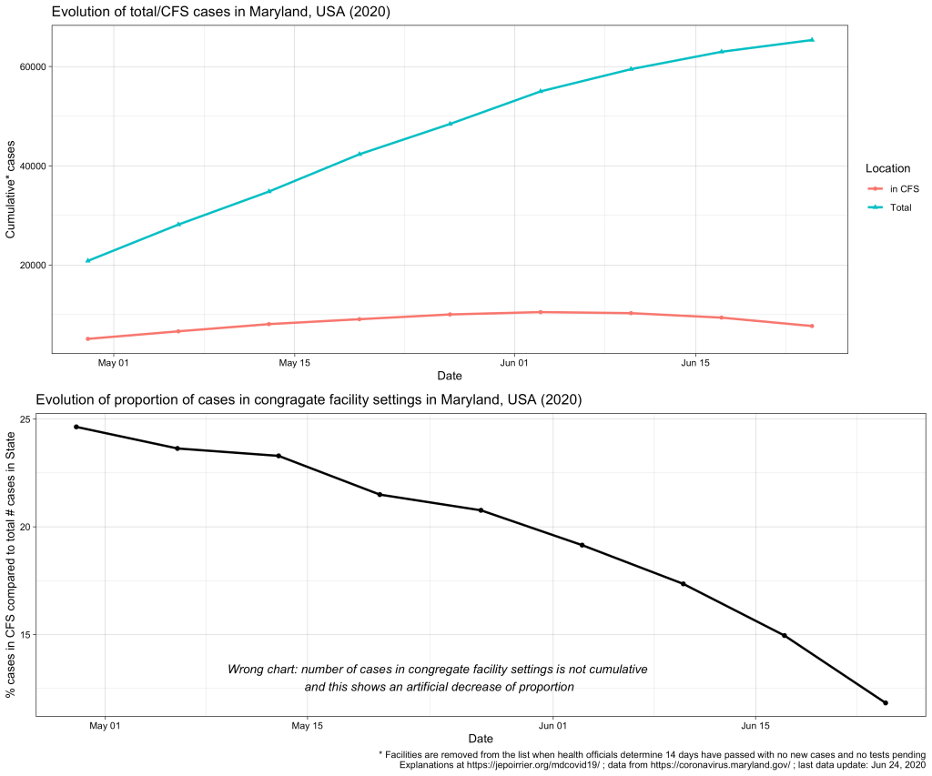 Also, you can’t put things in perspective because you can’t have a reliable proportion of cases in congregate facility settings compared to the total number of COVID-19 cases in Maryland. This total number of cases is cumulative and we see an artificial decrease in % of cases in these facilities, as illustrated below: