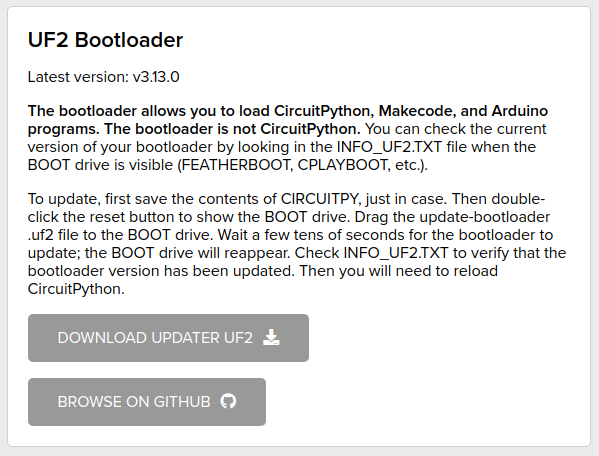 At the time of writing this post (April 4, 2021), the latest UF2 bootloader is v3.13.0.