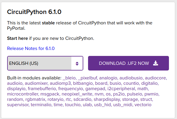 Stay on the previous page and go back up. There, you’ll see the “CircuitPython” section, download the UF2 file with the latest release. Press twice the reset button on your PyPortal and then copy this .uf2 file too (the PyPortal will reboot).